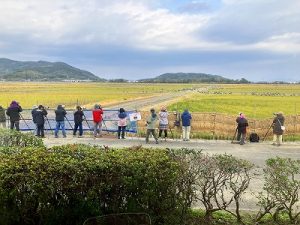 Many bird watchers are observing and taking photos of the cranes also on the ground.